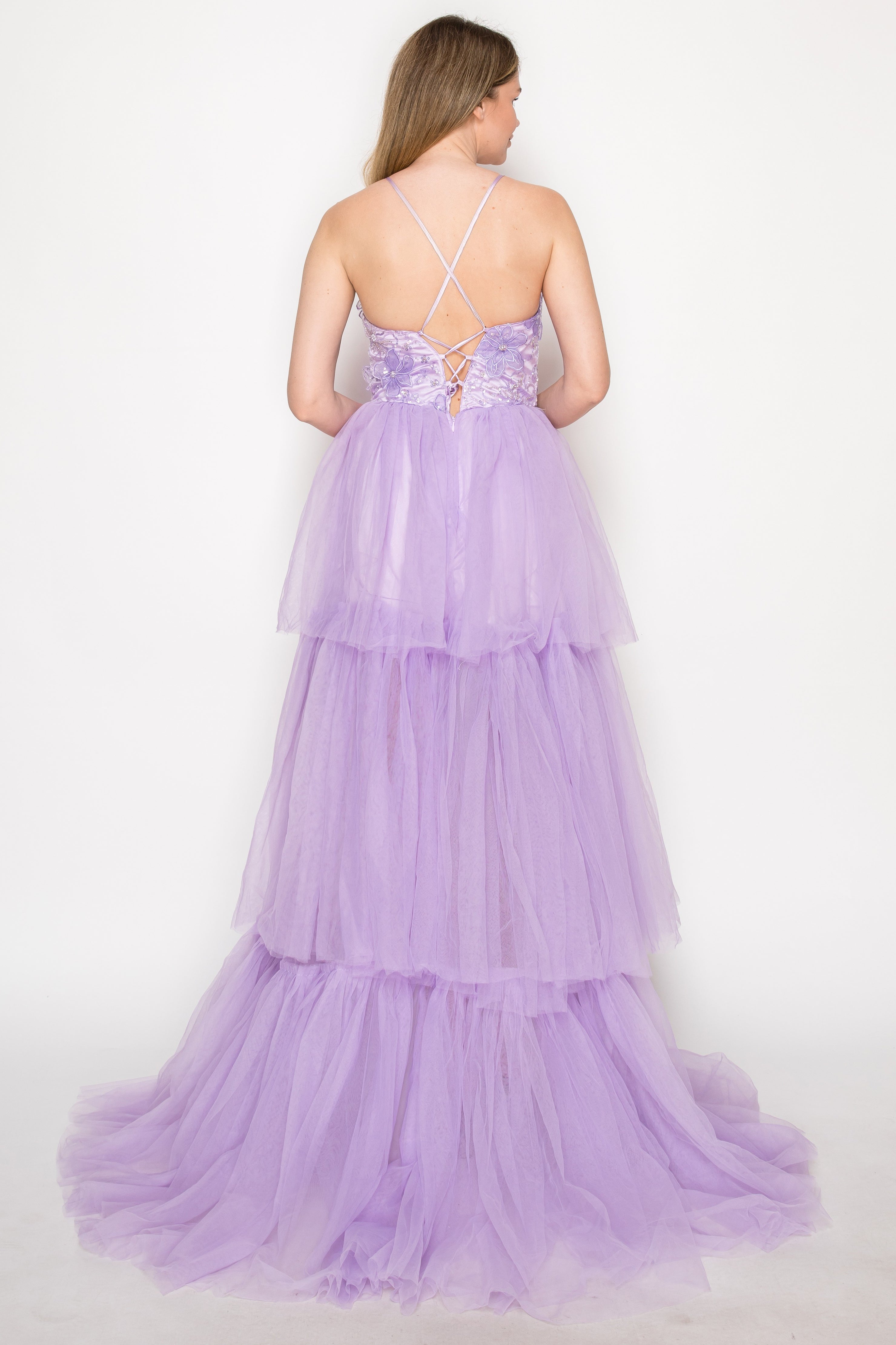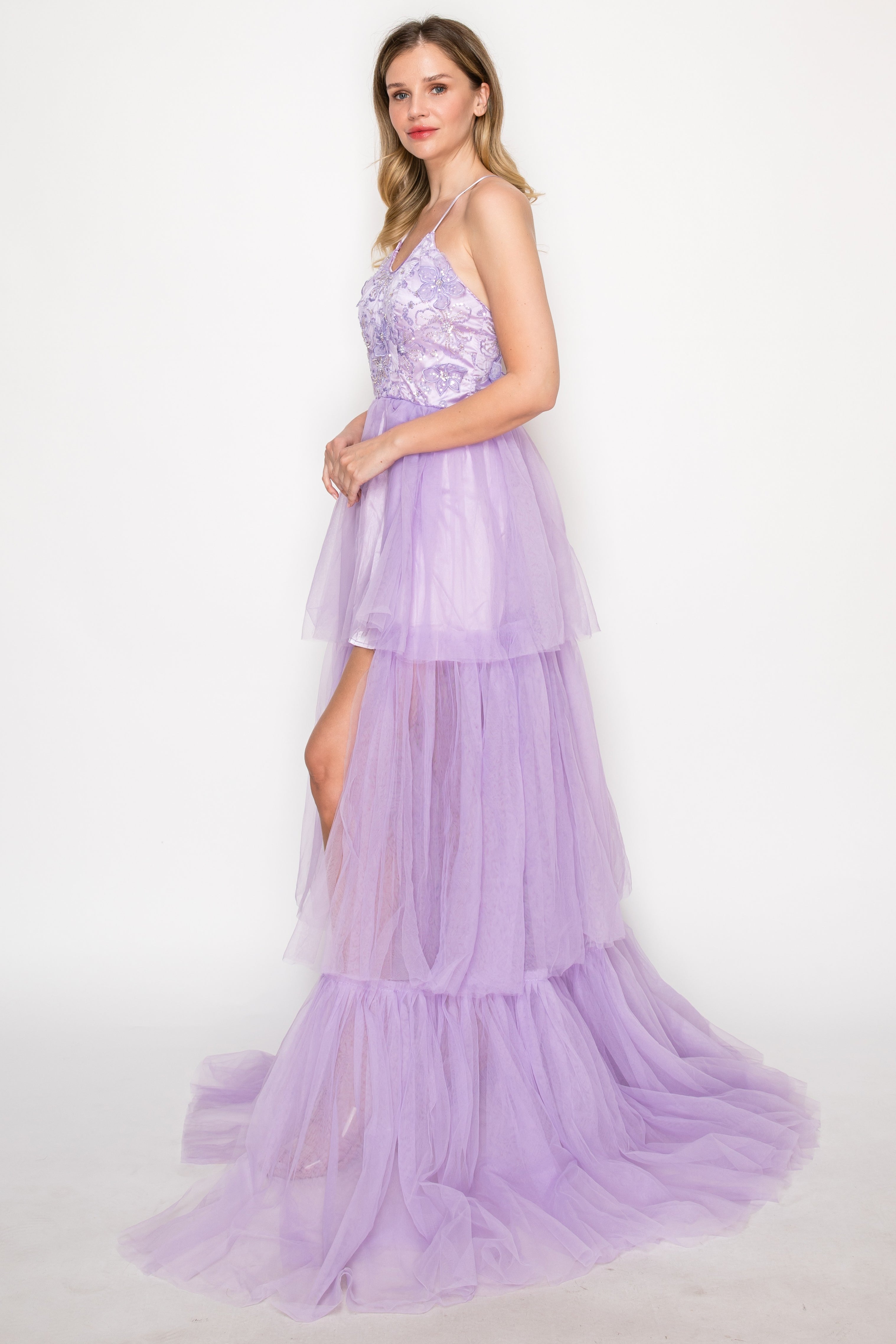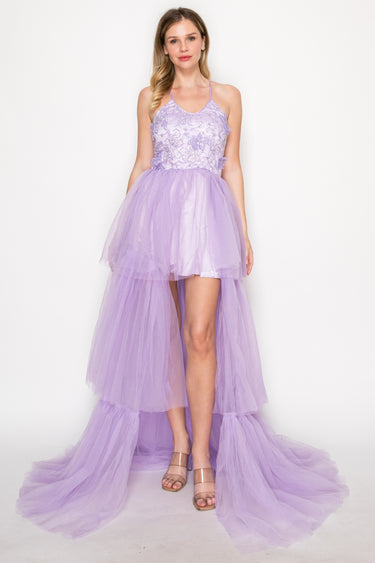 Playful and romantic, this high-low tulle gown flows behind you like a cloud of lavender dreams.