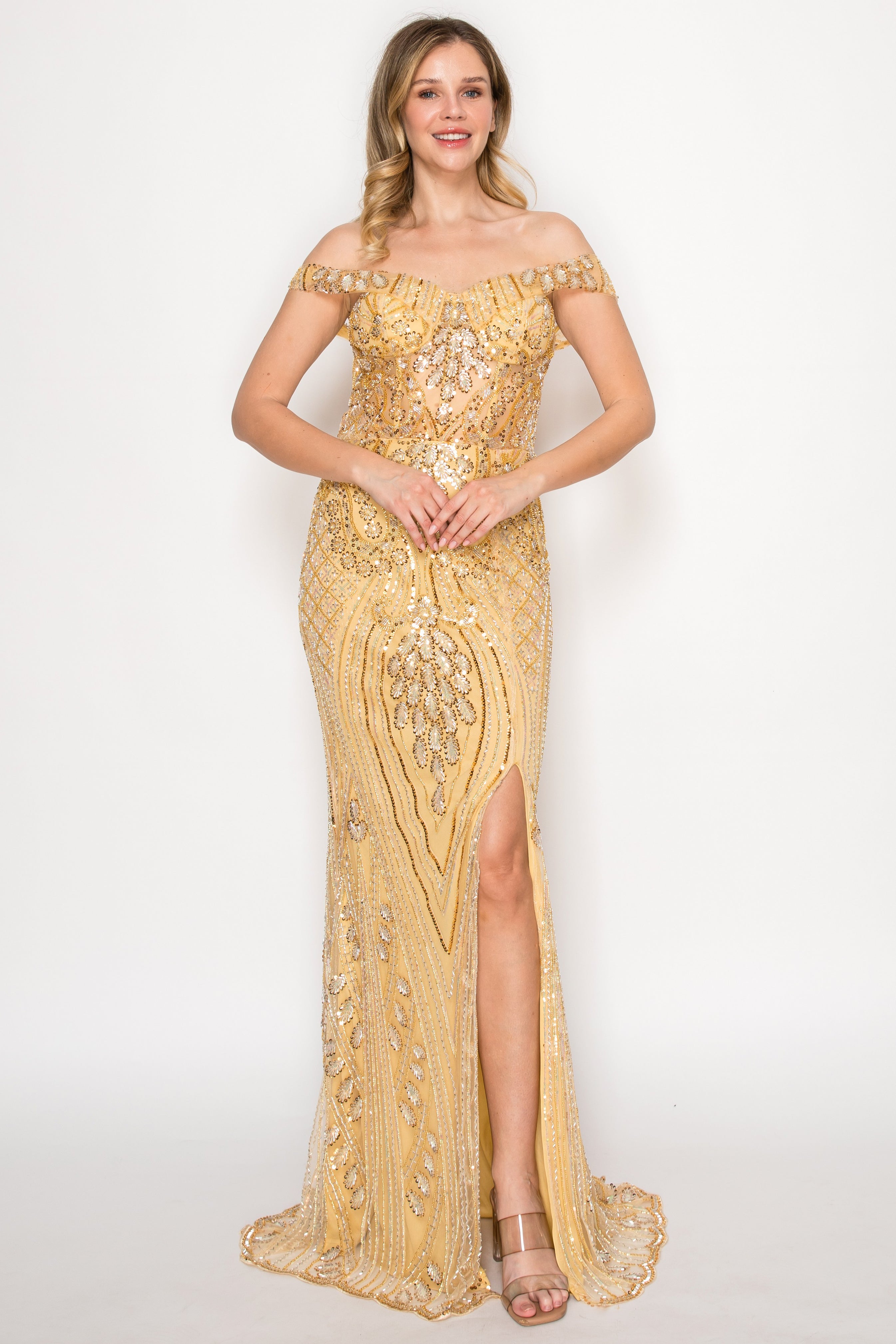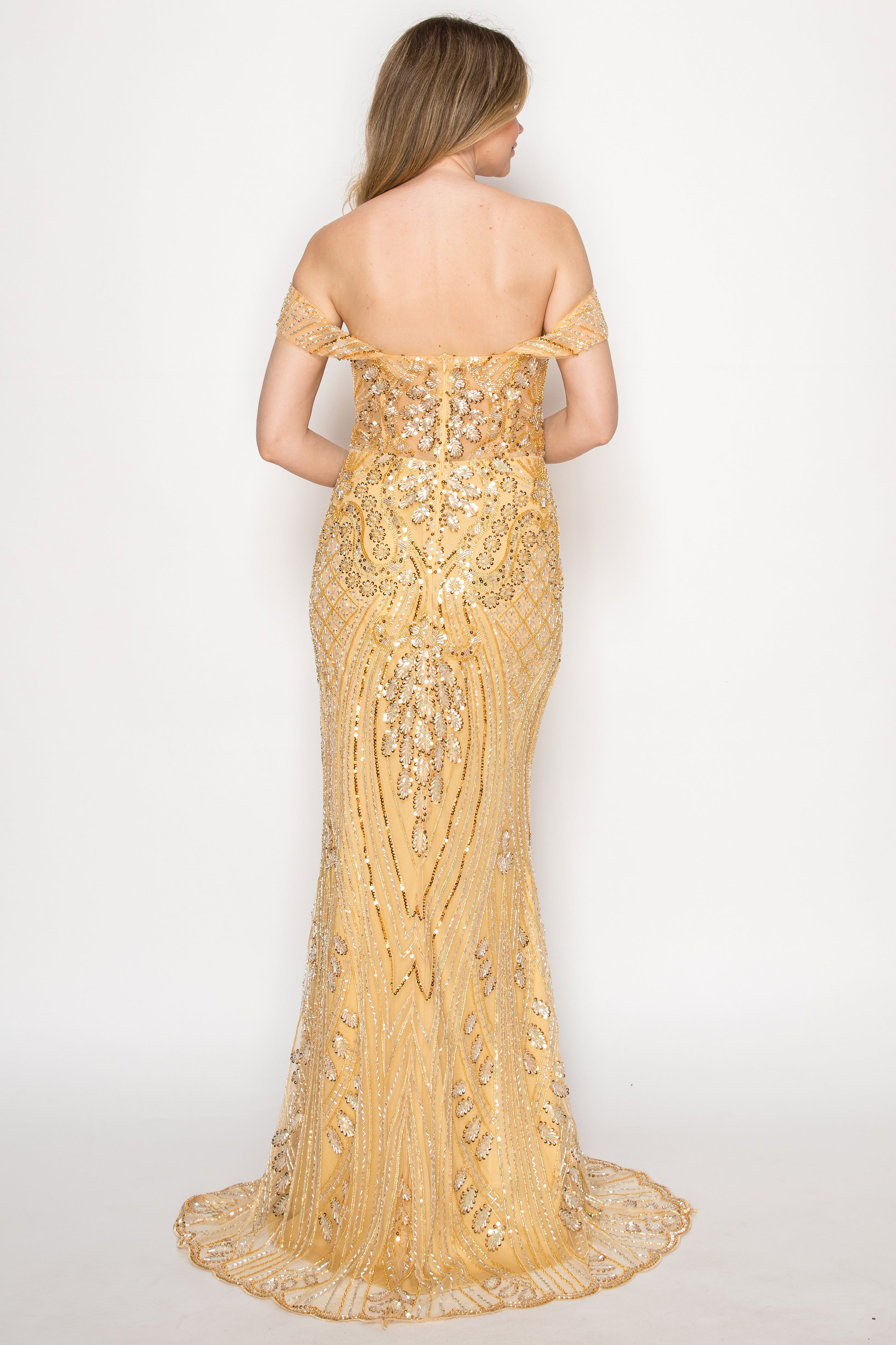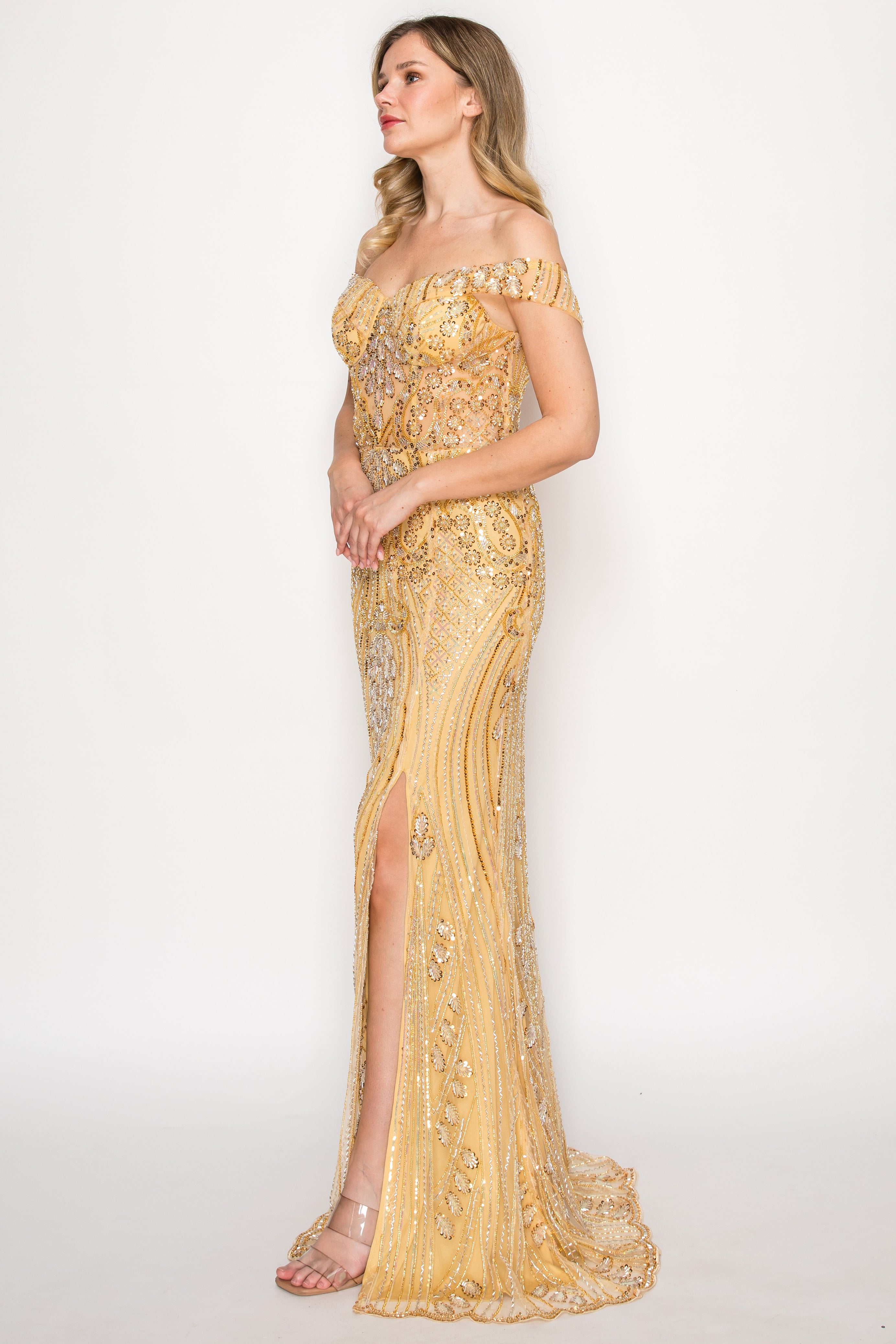 Sparkling with intricate floral beadwork, this off-shoulder gown blooms with every move in a luxe, form-fitting silhouette and graceful side slit.