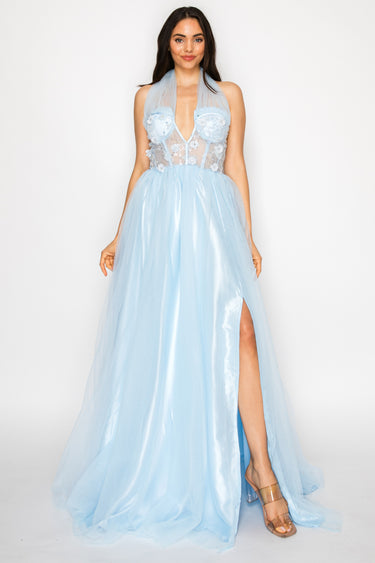 Dreamy halter gown with a sheer floral-embroidered bodice, flowing tulle skirt, and thigh-high slit. A fairytale look made for special occasions.