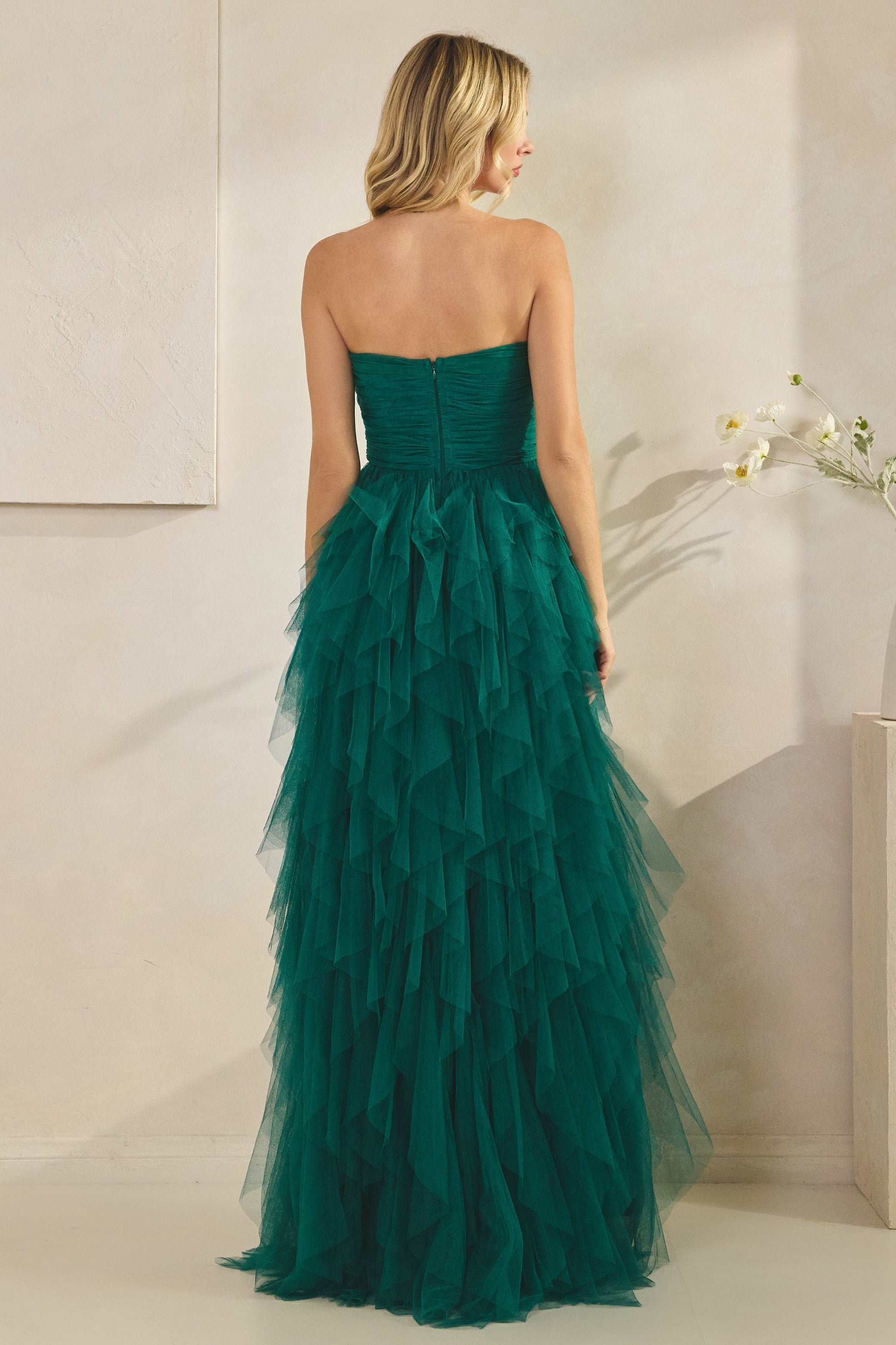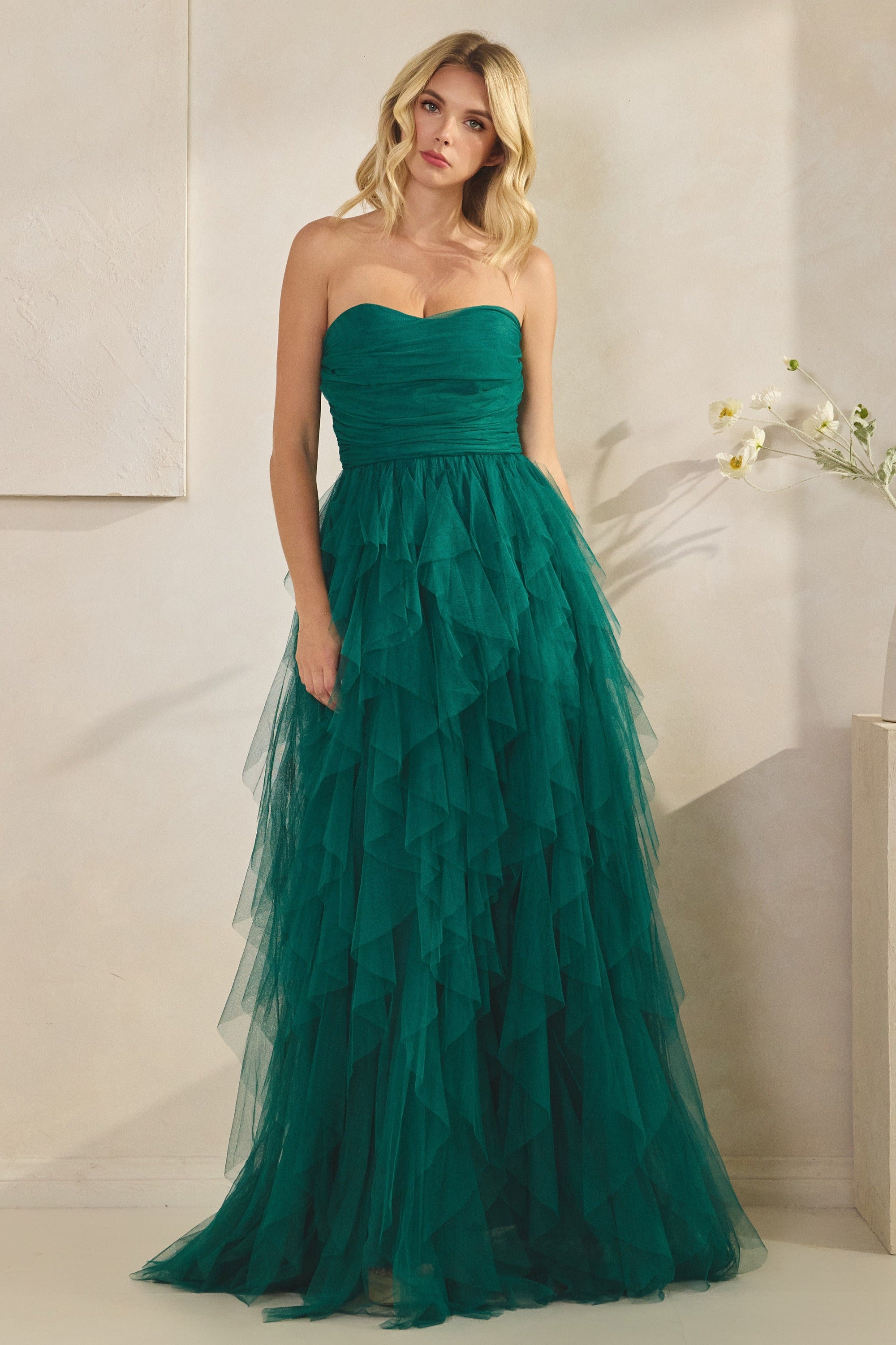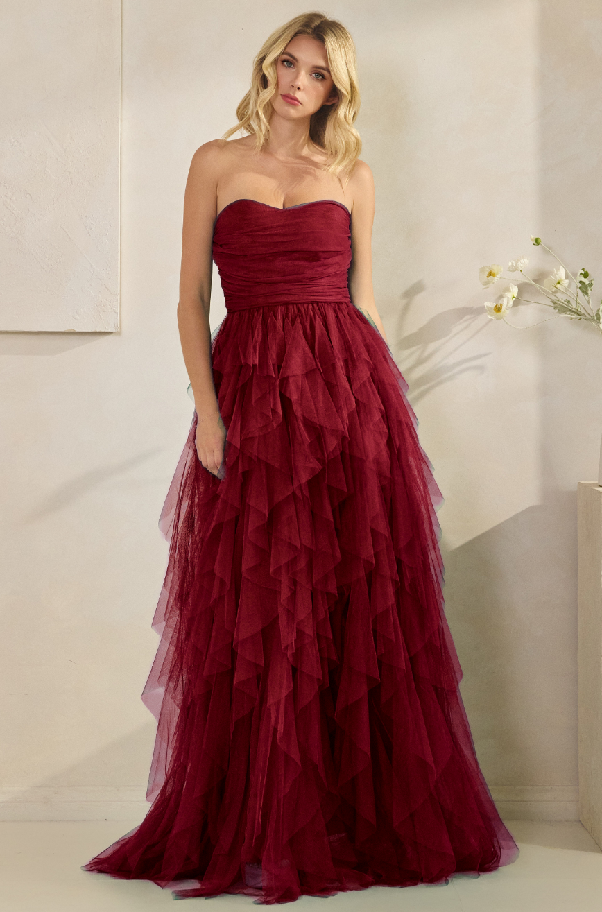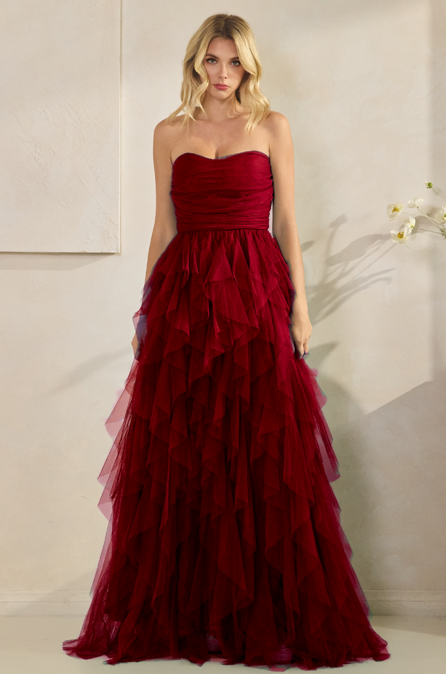 Strapless gown with a ruched bodice and layered tulle skirt. Features a fitted waist and cascading ruffle texture, creating a bold and elegant look for formal occasions.