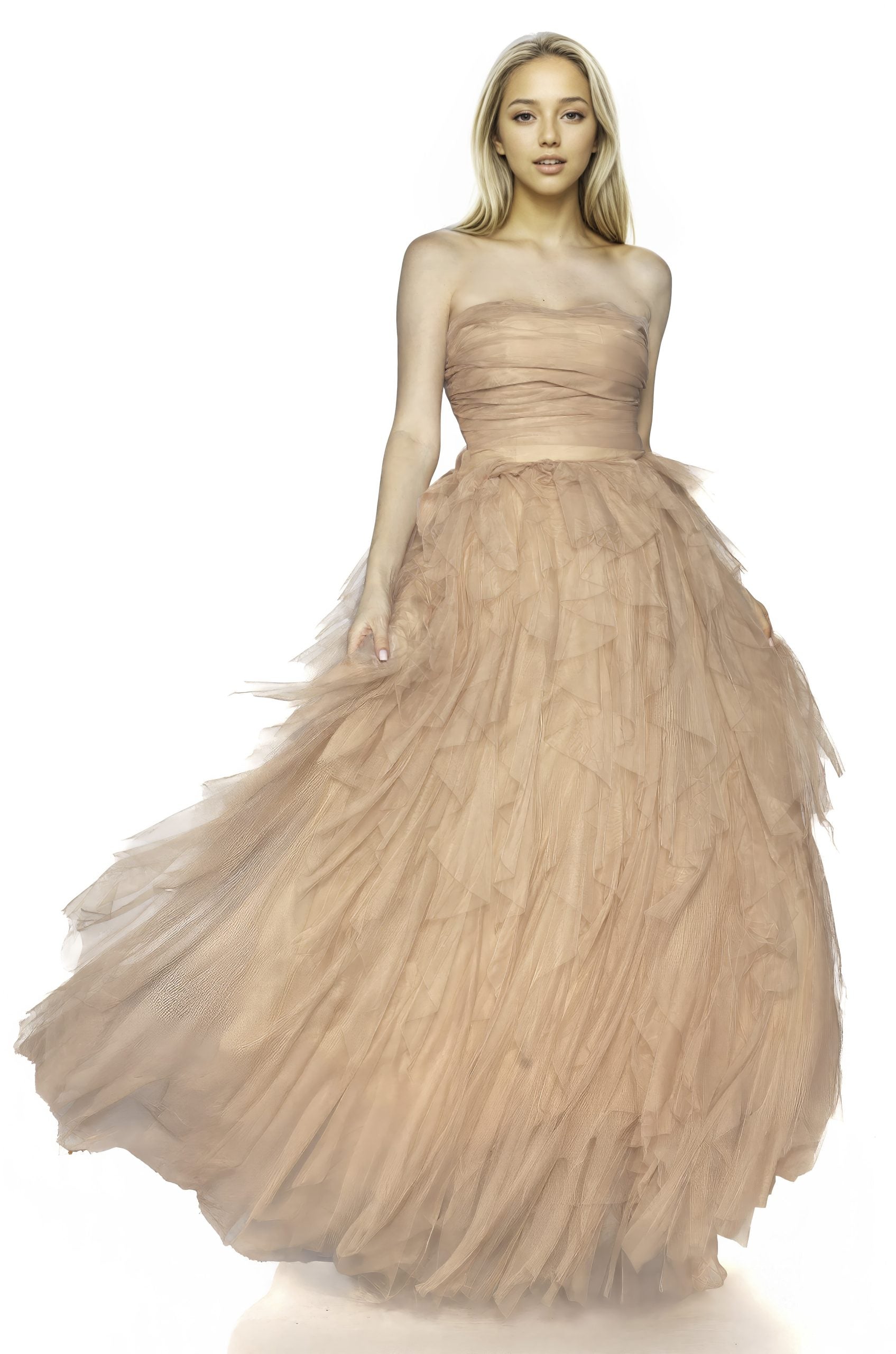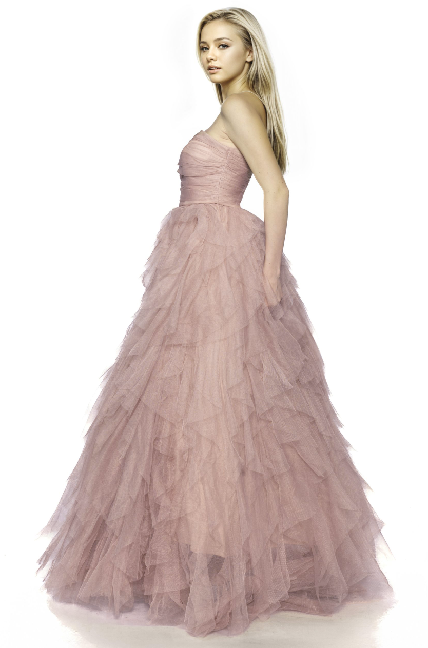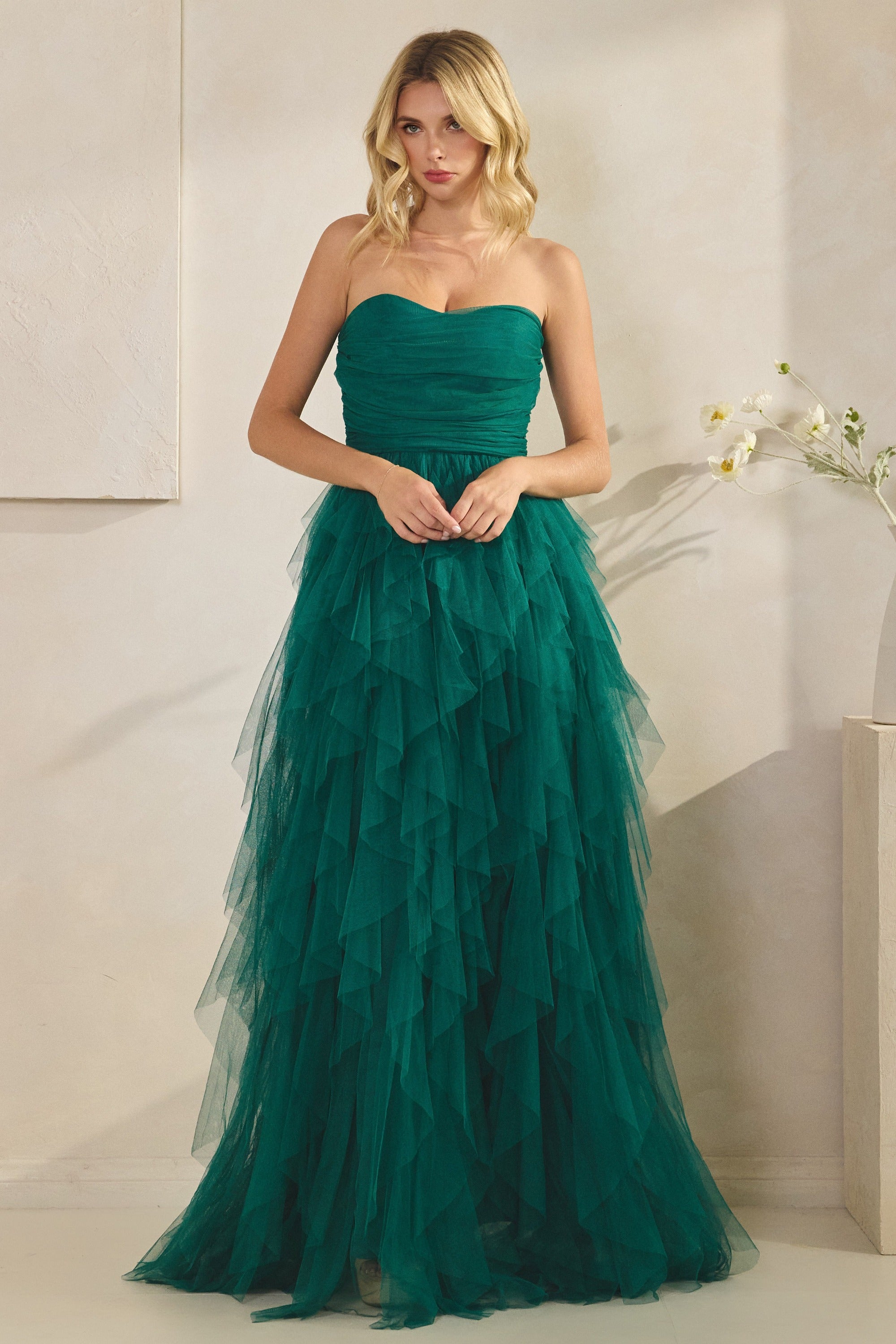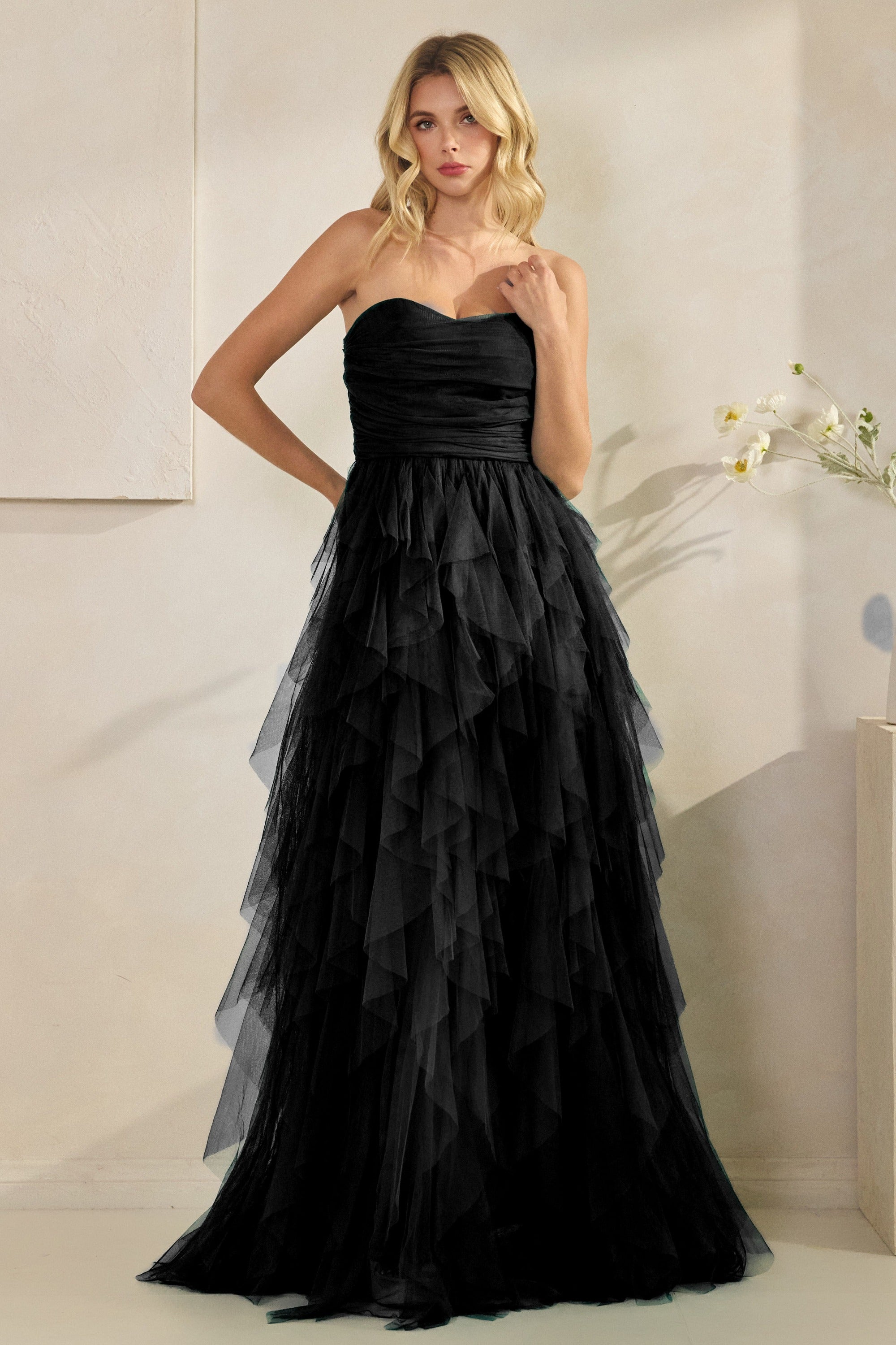 Strapless gown with a ruched bodice and layered tulle skirt. Features a fitted waist and cascading ruffle texture, creating a bold and elegant look for formal occasions.