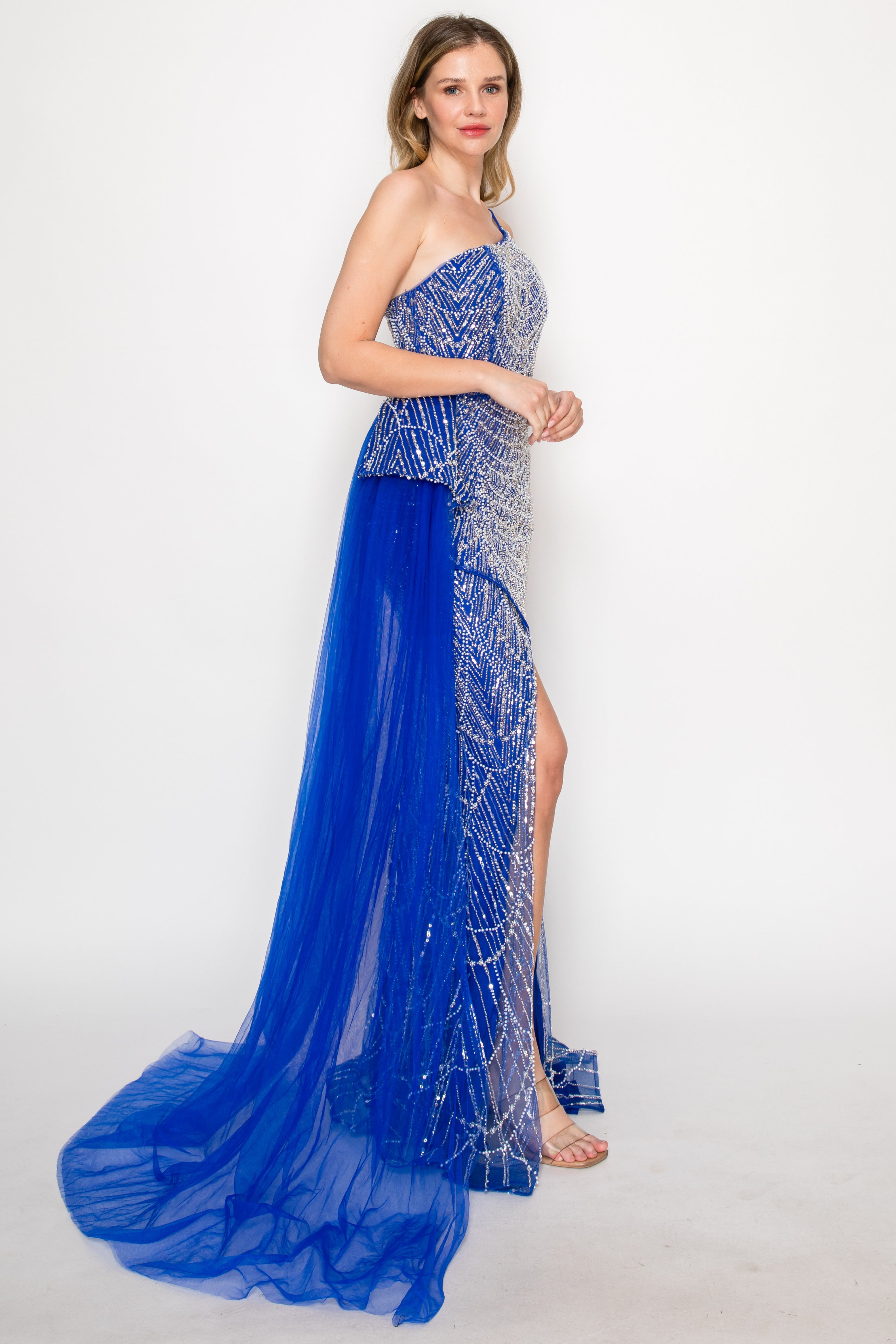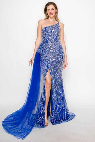 A one-shoulder masterpiece adorned with radiant beadwork and a flowing tulle train, perfect for making a grand entrance.